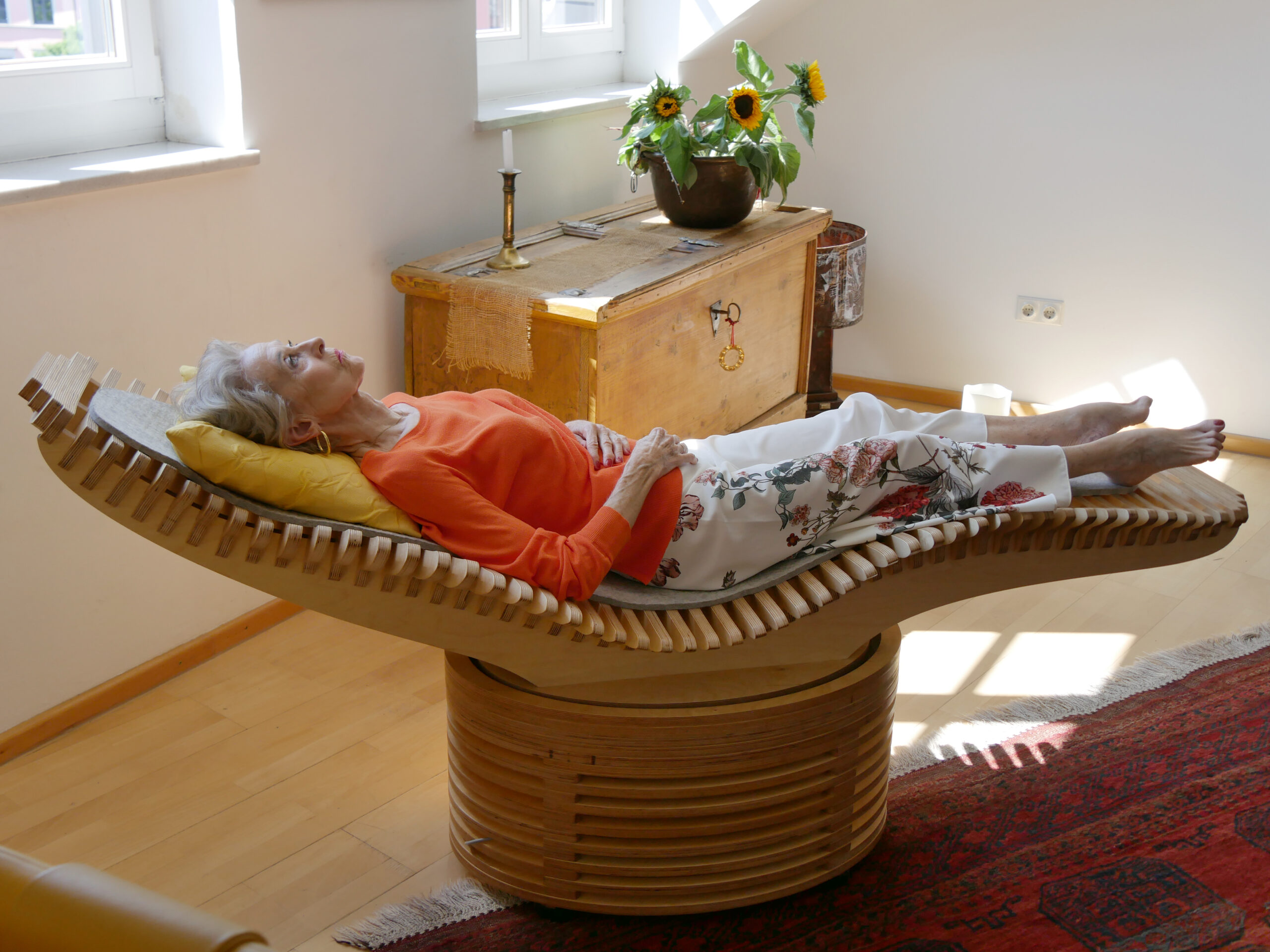 Ein innovativer elektrischer Antrieb versetzt die Liege in eine sanfte, multidimensionale > Schwingung.